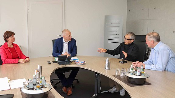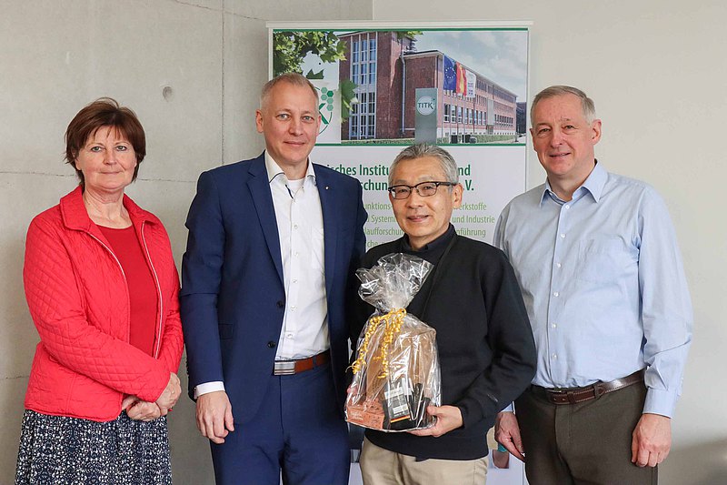 Am vergangenen Wochenende trat Prof. Dr. Sano nun wieder die Heimreise an. Zuvor wurde er von TITK-Direktor Benjamin Redlingshöfer, Abteilungsleiter Dr. Thomas Reußmann und der stellvertretenden Abteilungsleiterin Carmen Knobelsdorf offiziell verabschiedet. „Von unserer Seite stehen Ihnen alle Türen offen für eine weitere Vertiefung unserer Zusammenarbeit“, betonte Benjamin Redlingshöfer zum Abschied und überreichte Prof. Dr. Sano ein bayrisch-thüringisches Abschiedsgeschenk: fränkischen Wein im Bocksbeutel, handgemachte Pralinen aus Erfurt sowie zwei Paar Socken mit der am TITK entwickelten, hautpflegenden Cell Solution® SKIN CARE-Faser mit Vitamin E.
