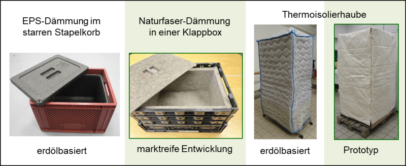 Im Rahmen des Projektes gelang es, eine vliesstoffbasierte wärmedämmende, poröse Basisschicht aus marktverfügbaren Naturfasern und naturbasiertem Binder zu entwickeln, die mit konventioneller Anlagentechnik industriell gefertigt werden kann. Dieser Lösungsansatz wurde anwendungsseitig als Thermoisolierung einerseits in einem Stapelkorb für den Transport verpackter Lebensmittel und andererseits als Kernmaterial einer Thermohaube für Rollwagen im Bereich des Lebensmitteltransportes getestet. In beiden Anwendungen konnten die entwickelten Prototypen die gestellten Produktanforderungen hinsichtlich Handhabung und Wärmedämmeigenschaften sehr gut erfüllen. Die Anwendung als Stapelkorbdämmung wurde bis zur Praxisreife optimiert. Hier können gegenüber der erdölbasierten Konkurrenz zusätzliche Nutzeffekte erzielt werden: