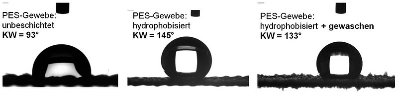 Neben bekannten konnten vor allem neuartige 2-Oxazoline mit einer regenschirmartigen Molekülstruktur erfolgreich synthetisiert, in Reinheit und Struktur gesichert und anschließend erstmals als textile Appretur appliziert werden. Stabile Kontaktwinkel zwischen 130° und 140° gegen Wasser konnten für viele Versuchsreihen bestimmt werden, was einer sehr guten hydrophoben Ausrüstung der textilen Oberfläche entspricht. Die Werte liegen zudem im gewünschten hydrophoben Bereich, den heutige fluor- oder auch wachsbasierte Alternativen aufweisen. In der Spitze konnten mit speziellen Zwischenschichten sogar Kontaktwinkel von 140° bis sogar 146° erreicht werden, was nah an superhydrophobes Verhalten heranreicht (ab 150°). Zudem sind die Appreturen sehr robust und überstehen sogar teilweise 15 Wäschen bei 60 °C für 90 min (DIN 53920). Die Beladungen reduzieren sich zwar deutlich, dennoch waren bei einigen Proben 0,5-2,5 m% Restbeladungen zu finden. Selbst bei geringeren Werten lassen sich noch Kontaktwinkel nach dieser enormen Belastungsprobe von 120° bis 130° beobachten und somit weiterhin hydrophobes Verhalten bescheinigen (Abb. 1). Mit Olivenöl waren ebenfalls erste positive Effekte festzustellen. Es ließen sich auf den mit Oxazolinen beschichten Textilien Kontaktwinkel von größer 90° bei Einsinkzeiten von 3 s vs. PFAS-Ref. 110° für 2 min finden. Zukünftiger Forschungsbedarf besteht darin, durch gezielte Abstimmung bzw. Auswahl des textilen Trägers (Flächengewichte, Maschenweiten etc.) die bislang auftretende, unzureichende Dichtigkeit gegen Wasser („Hydrostatischer Druckversuch“) zu verbessern und Reproduzierbarkeit zu gewährleisten. Zur Verbesserung der ölabweisenden Eigenschaften sind zudem tiefergehende Studien insbesondere hinsichtlich Zwischenschichten bzw. Strukturierungen erforderlich.