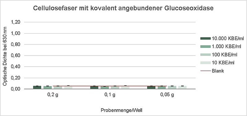 Im Fokus standen verschiedene Vernetzungsreaktionen mit unterschiedlichen Proteinen wie Gelatine, Soja, Keratin und Glucoseoxidase als Model-Enzym. Als Reagenzien wurden sowohl typische Proteinvernetzer als auch typische Agentien zur Oberflächenausrüstung verwendet und die Bedingungen für eine permanente Anbindung eruiert. Dabei gelang es, mit unterschiedlichen Agentien, in Waschversuchen nichtauswaschbare Beschichtungen mit Proteinen herzustellen. Für das Enzym wurden insbesondere Agentien gewählt bei denen keine Nachbehandlung mit erhöhter Temperatur notwendig ist. Für die Fasern an denen eine Enzymanbindung erfolgreich war, konnte eine eindeutige H2O2 Exposition und die Hemmung des Bakterienwachstum von S. aureus Bakterien nachgewiesen werden (siehe auch Abbildung ). Die angebundenen Proteine verändern zudem die Oberflächentextur der Textilien, was auch fühlbar ist. Es wurde zudem eine maximal mögliche Menge an Protein in Abhängigkeit vom verwendeten Protein an der Faseroberfläche festgestellt.