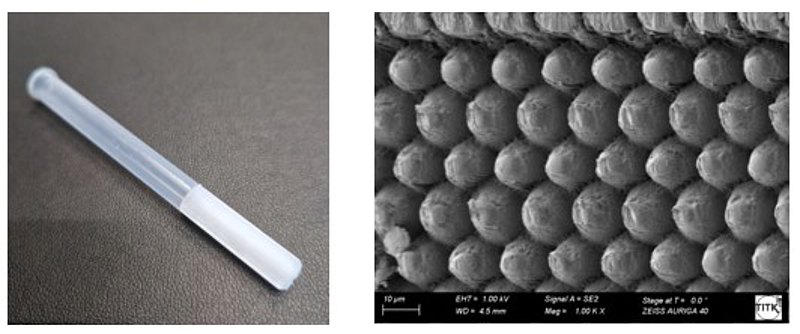Dazu wurden in Zusammenarbeit mit einem Projektpartner die Möglichkeiten der Laserstrukturierung und -bohrung von Werkzeugstahl untersucht und Strukturmuster sowohl auf planen wie auch auf gekrümmten Flächen hergestellt. Von besonderem Interesse waren periodisch angeordnete Linien- und Noppenmustern, wie sie in ähnlicher Form und Größe auch vom Lotuseffekt bekannt sind. Das Spritzgießen konnte so angepasst werden, dass die Werkzeugstruktur mit sehr hoher Genauigkeit abgeformt wurde und ein stabiler Prozess mit gutem Entformungsverhalten gesichert war. Das neue Verfahren konnte an einer Pipettenspitze prototypisch umgesetzt werden. Es wurden wasser-abstoßende Eigenschaften mit einem Kontaktwinkel > 135° realisiert.