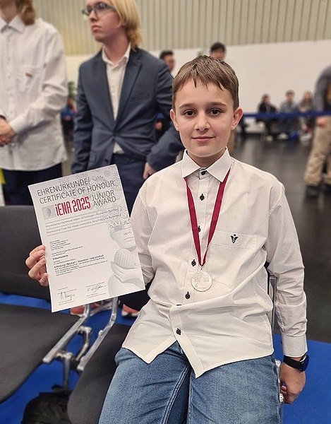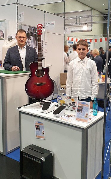 Vorgestellt wurden beide Innovationen in bewährter Weise von TITK-Arbeitsgruppenleiter Dr. Lajos Szabó, der diesmal seinen Sohn Daniel an seiner Seite hatte. Der 13-Jährige ist in Sachen Erfindergeist und Ideenreichtum ganz der Papa und durfte sich so über eine eigene Silbermedaille als Jugenderfinder freuen. Sein neuartiger, selbst entworfener und angefertigter Volumenregulator für Gitarristen eröffnet Musikern neue kreative Möglichkeiten auf der Bühne und könnte in Zukunft eine spannende Alternative zu den klassischen Volumenpedalen werden.