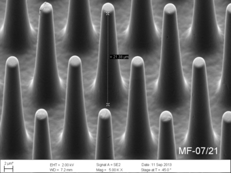 Die durchgeführten Versuche bestätigen, dass die verfahrenstechnische Umsetzung des Prozesses zur Mikrostrukturierung von Bauteiloberflächen im Spritzgießprozess realisiert werden kann und die gewünschte Oberflächentopographie herstellbar ist. Mit Hilfe der entwickelten Technologie gelingt es Strukturen im Größenbereich von 1 µm mit hohem Aspektverhältnis und hoher Strukturgüte herzustellen. Bereits ohne Additive und zusätzliche Beschichtungen wird dadurch eine enorme Reduzierung der Oberflächenspannung erzielt. Strukturierte Bauteile aus Polypropylen weisen gegenüber Wasser ein nahezu superhydrophobes Verhalten mit Kontaktwinkeln von über 150° auf.