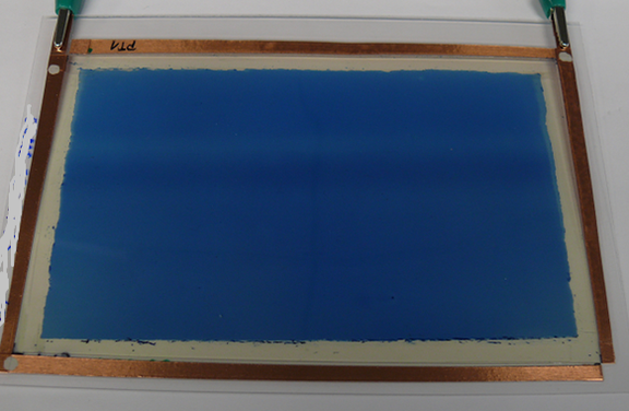 Im Projekt wurden neue und bereits erprobte Spezialpolymere synthetisiert, die elektrochrome oder ladungskompensierende Eigenschaften besitzen. Ziel war hierbei die spezifische Variation der einzelnen Strukturglieder (Monomere) hinsichtlich der Beeinflussung sterischer und elektronischer Effekte und damit der elektrochromen Eigenschaften des jeweiligen Polymers. Ferner wurde die Anpassung der jeweiligen Polymeren sowie eine Übertragung der Beschichtungsverfahren auf eine kontinuierlich arbeitende „Rolle-zu-Rolle“-Maschine durchgeführt, um Trockenfilme mit Schichtdicken von 200 bis 500 nm sowie mit Transmissionswerten zwischen 65 und 80 T% zu erzielen.