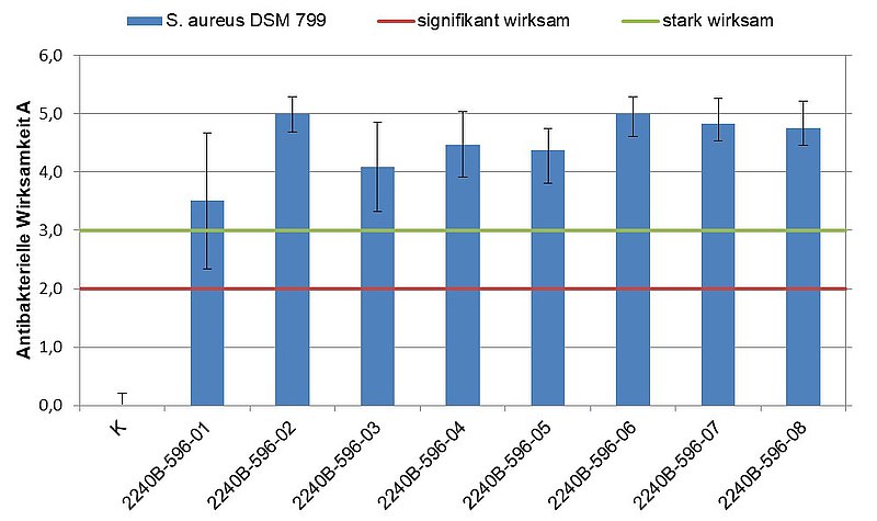 Die antimikrobielle Wirkung konnte an den textilen Demonstratoren erfolgreich nachgewiesen werden. Die antibakteriellen Eigenschaften der Gewebe wurde in Anlehnung an die DIN ISO EN 20743:2013 bestimmt. Als Prüfkeime fanden Staphylococcus aureus und Klebsiella pneumoniae Verwendung. Die Abbildung zeigt die antibakterielle Wirkung von Geweben mit Lyocell-AgXX-Funktionsfaser und verschiedenen Bindungsarten gegenüber dem Prüfkeim Staphylococcus aureus (gram-positiv).
