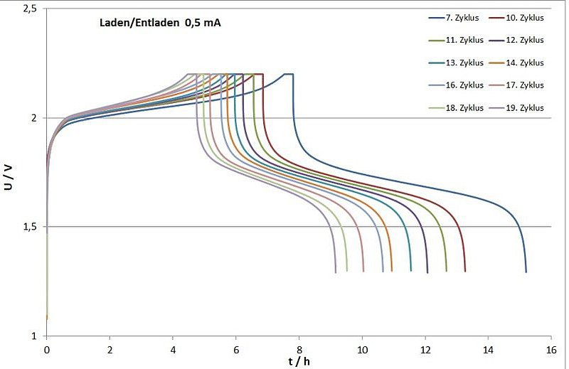 Die angestrebten Polymerelektrolyte wurden auf der Basis eines Polyvinylidenfluorid-Copolymers (PVDF:HFP), einer ionischen Flüssigkeit und einem Lithiumsalz formuliert. Unter Variation der einzelnen Bestandteile wurden gelartige Elektrolyte mit einer Scherviskosität bis 39 mPa s, einem Schermodul bis 30 kPa und einer elektrischen Leitfähigkeit bis 6 mS/cm erhalten. Die Elektrolyte sind auslaufsicher, temperaturstabil bis 300 °C und wider-standsfähig gegen Durchbiegung bis zu einem Winkel von 70°. Integriert in einen Akku mit LTO-Anode und LFP-Kathode liefert das System zuverlässig Strom bei einer Nennspannung von 1,9 V. Der Akku kann mehrfach geladen und entladen werden und speichert Ladungsmengen bis zu 2 mAh/cm².