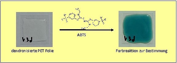 Es konnte gezeigt werden (siehe Abbildung), dass auf den beschichteten Folien Biomoleküle immobilisiert werden können. So können zum Beispiel Sensorsysteme bzw. Nachweiskits hergestellt werden. Im Projekt wurde auf den Folien Glucoseoxidase immobilisiert. Dadurch kann durch Zugabe eines Nachweissystems durch Farbreaktion die Glucosekonzentration von unbekannten Lösungen bestimmt werden.Anwendung