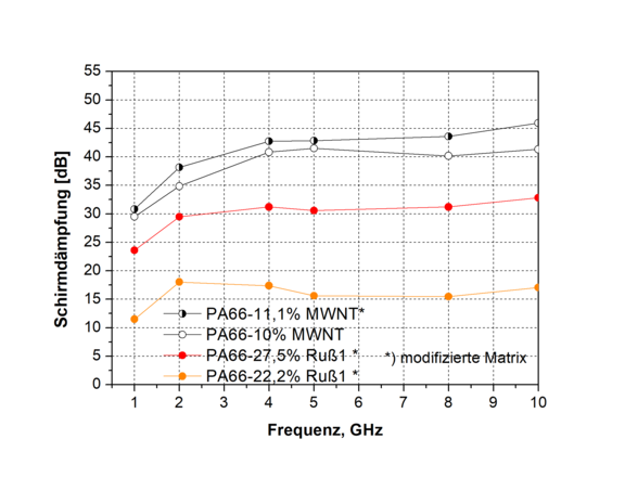 Zum Schutz vor elektromagnetischer Beeinflussung (Electromagnetic Interference, EMI) können Kunststoffe als schirmdämpfende Materialien im MHz- und im GHz-Bereich mit elektrischen leifähigen und magnetischen Additivkomponenten oder auch mit speziellen Füllstoffmischungen dieser Komponenten ausgerüstet werden.