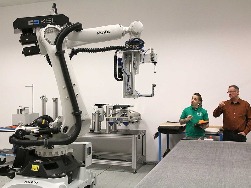 Ein weiterer Schwerpunkt ist das automatisierte Zuschneiden textiler Flächen mittels CNC-Cutter und das roboterunterstützte Stacken, Schweißen und Nähen von Verstärkungshalbzeugen. Mit modernster Anlagentechnik werden abfallarme und kostengünstige Lösungen für maßgeschneiderte Verbundaufbauten entwickelt.